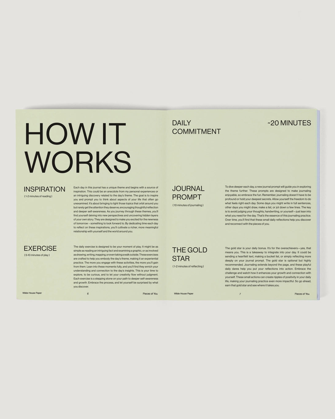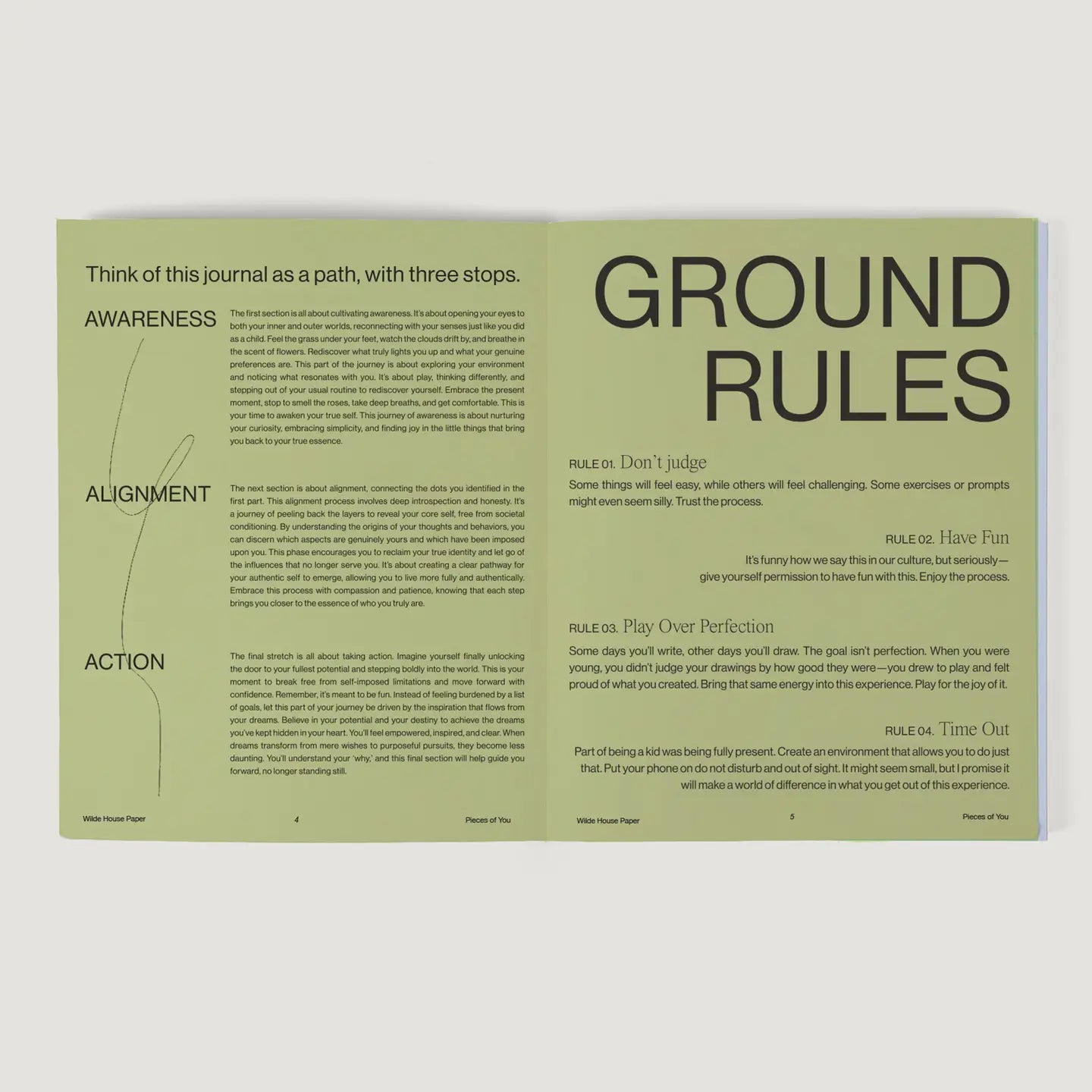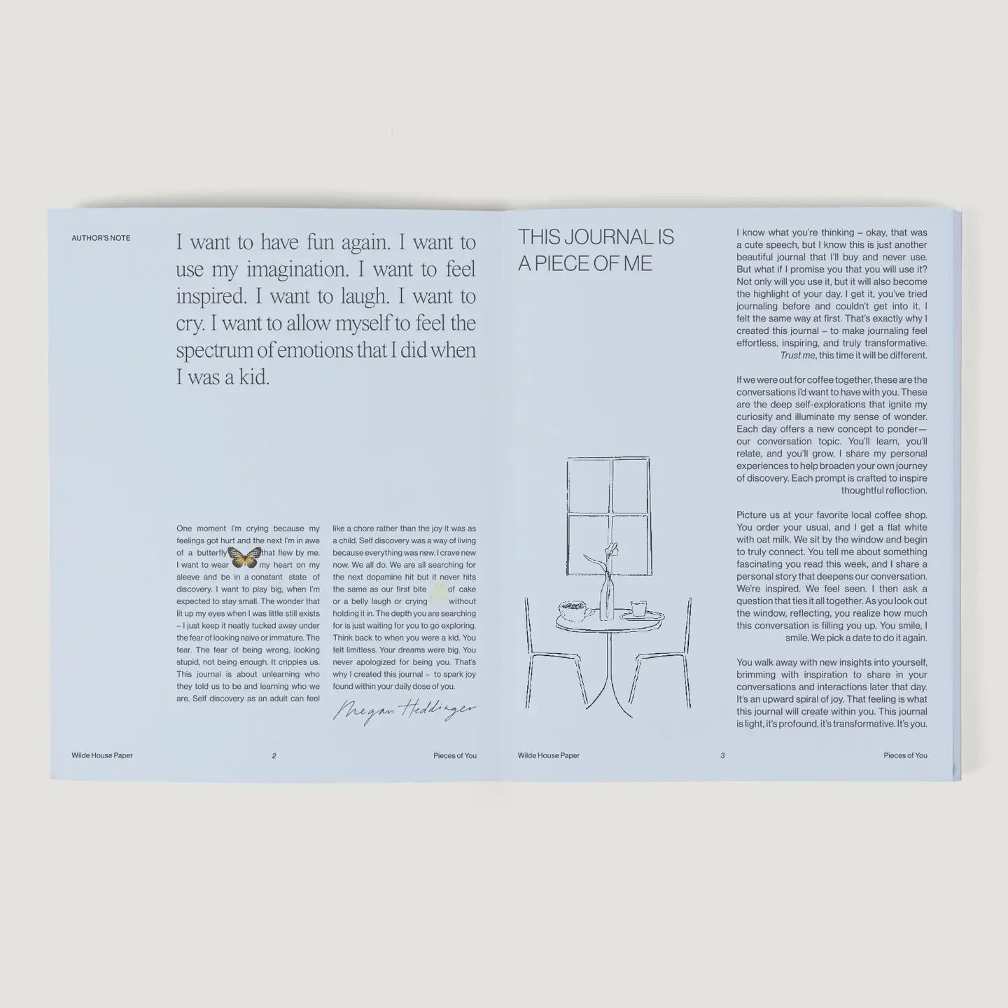 Think back to your childhood, a time when wonder, curiosity, and play were your everyday companions, untouched by the world's influences. The Pieces of You Journal is your invitation to reconnect with that pure, childlike state of mind. Journaling doesn’t have to be intimidating. Approach each day with the same openness you felt as a child, and rediscover the pieces of you that you lost along the way of growing up.